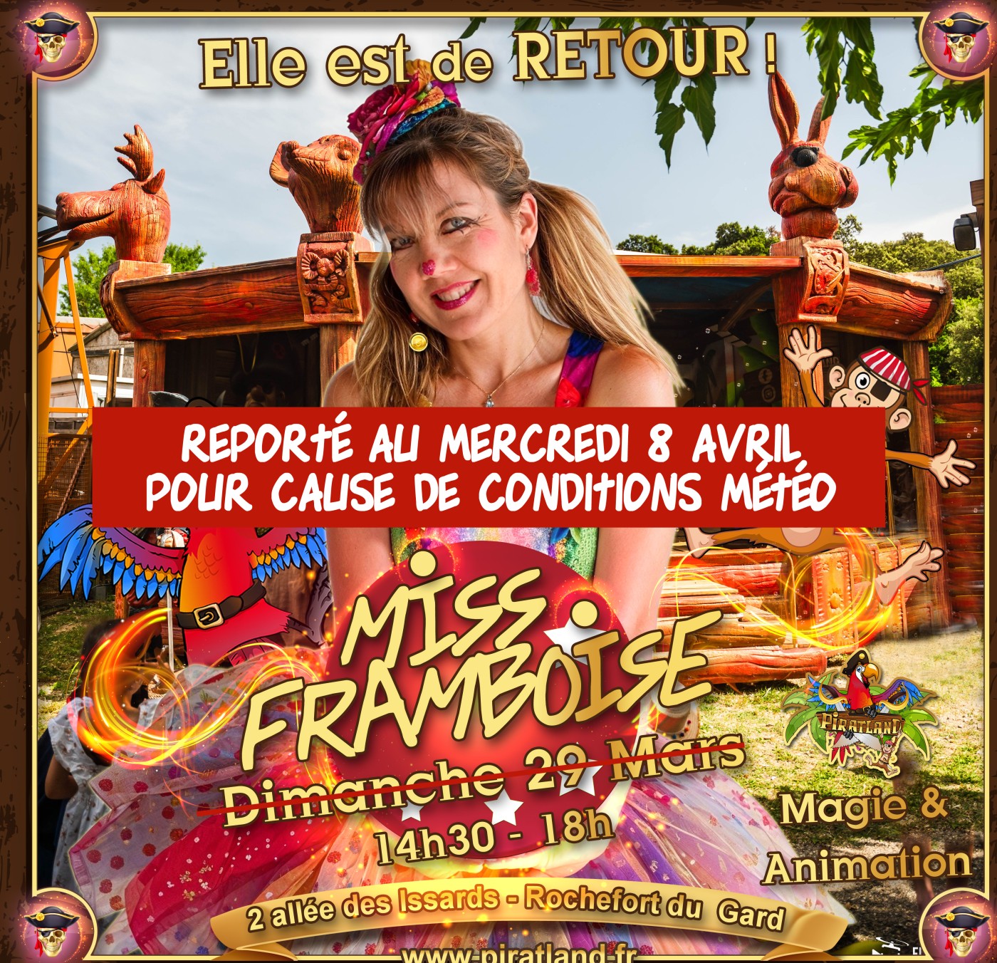 Miss Framboise de retour au parc ? Moitié pirate, moitié fée ? Elle sera en spectacle au parc avec ses ballons, des tours de magie extraordinaires et toute la tendresse qu'elle voue aux enfants.