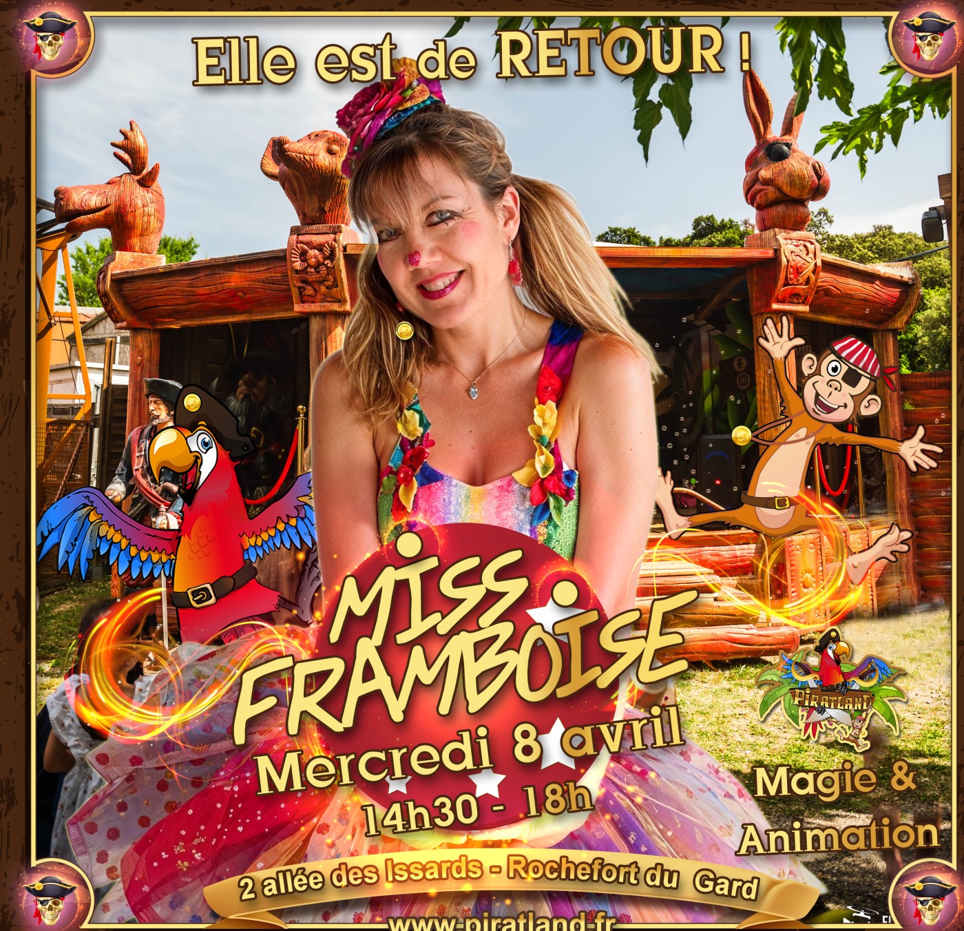 Miss Framboise de retour au parc ? Moitié pirate, moitié fée ? Elle sera en spectacle au parc avec ses ballons, des tours de magie extraordinaires et toute la tendresse qu'elle voue aux enfants.